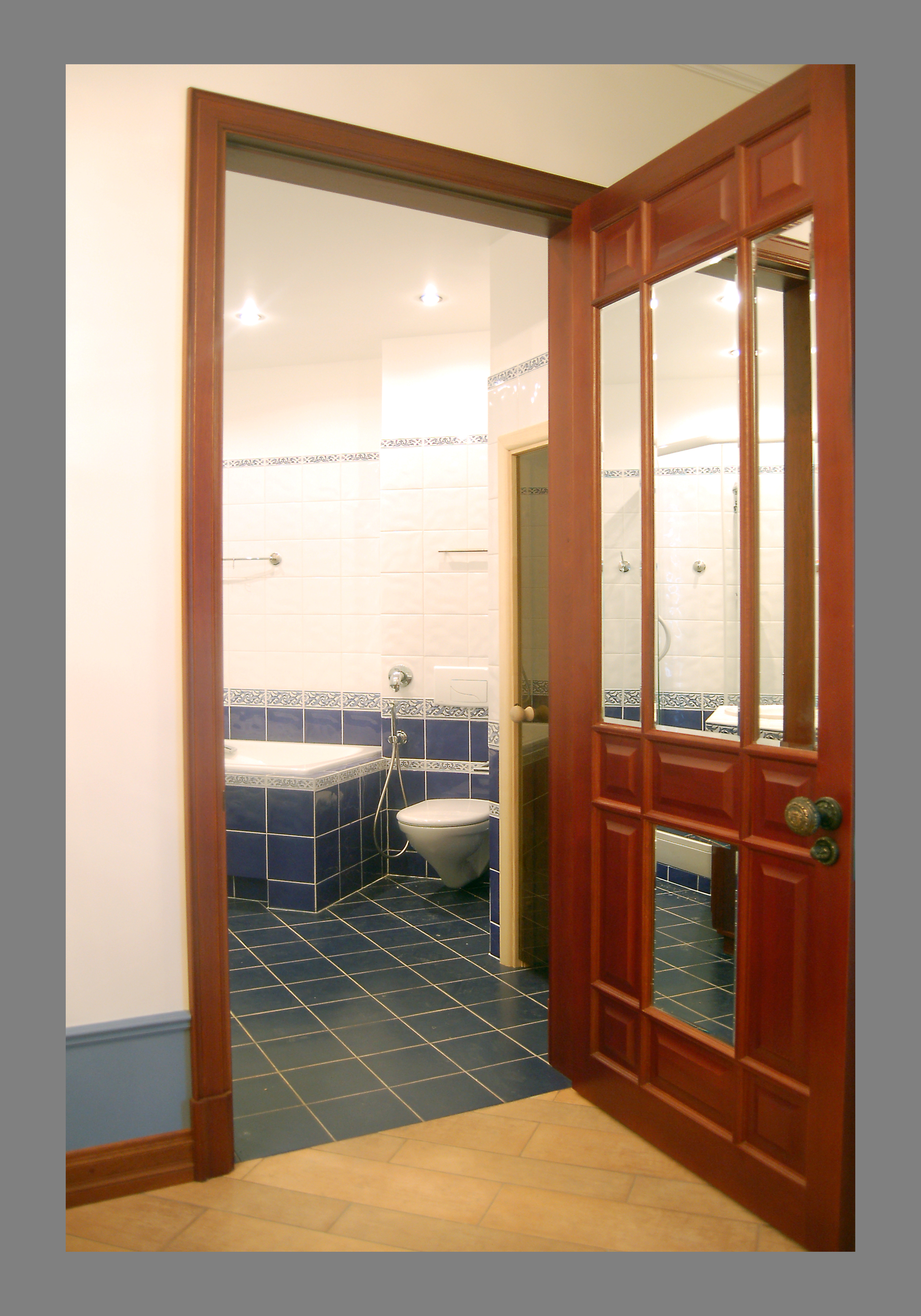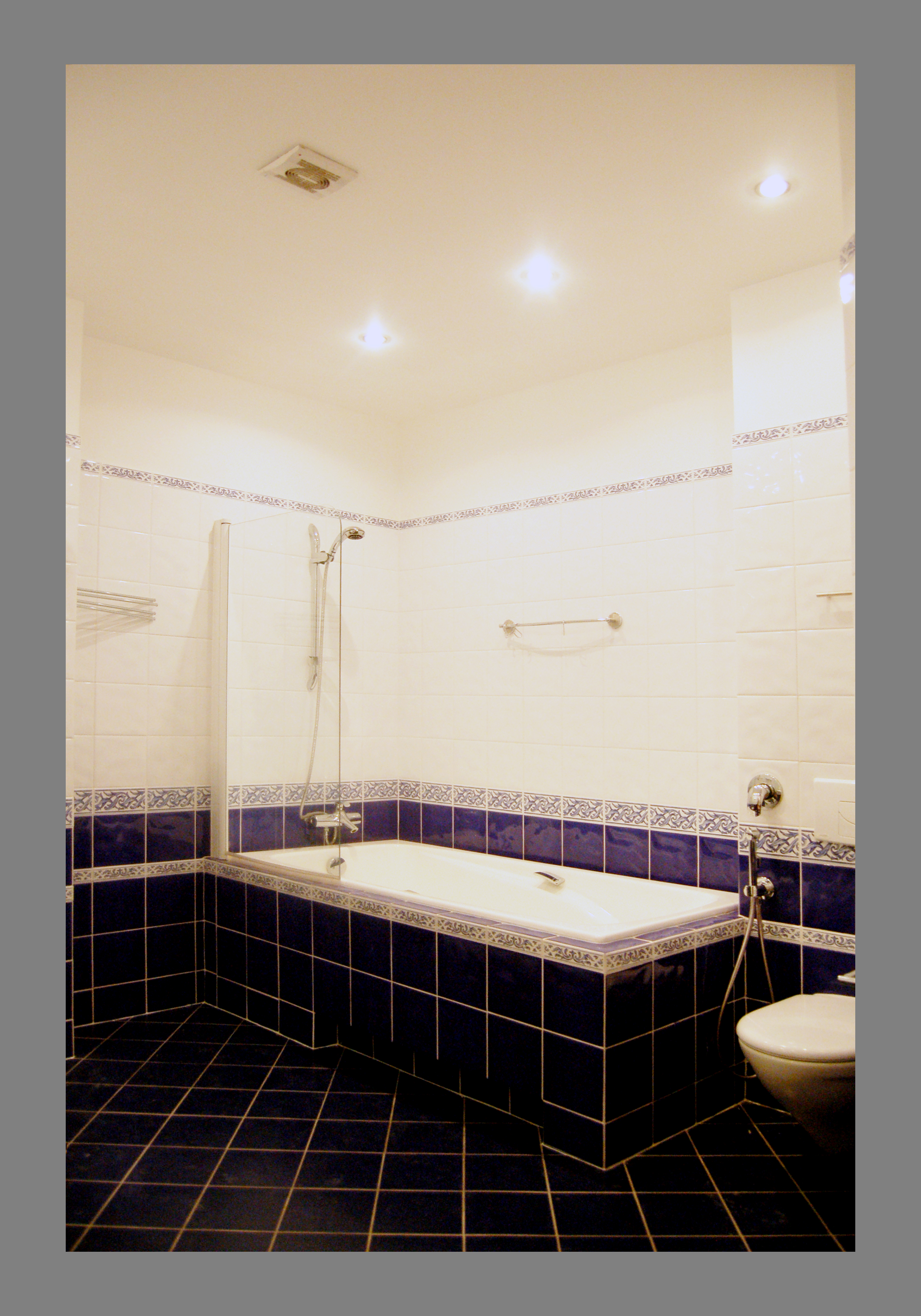 Крестовский остров, кв.120 м. кв., отделка "под" ключ". Ванная. Пол и стены - плитка. Потолок и стены - окраска. Краска - Benjamin Moore. Оборудование для окраски - компрессор. Фактура - "яйцо".