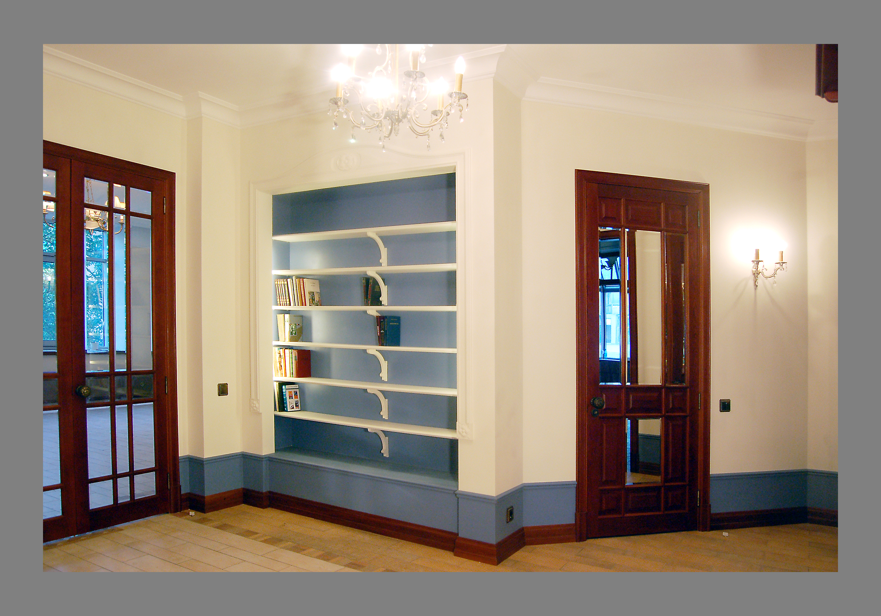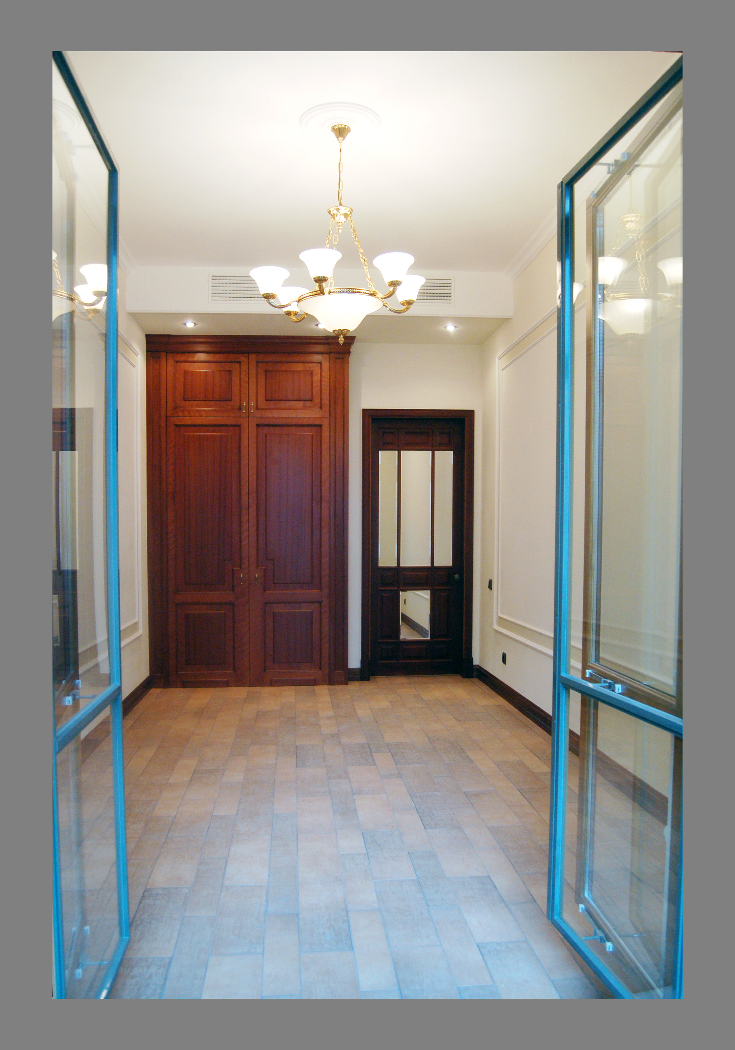 Крестовский остров, кв. 120 м. кв.,отделка "под ключ". Холл. Пол - плитка. Потолок и стены - окраска. Краска - Benjamin Moore. Оборудование для окраски - компрессор. Фактура - "мел".