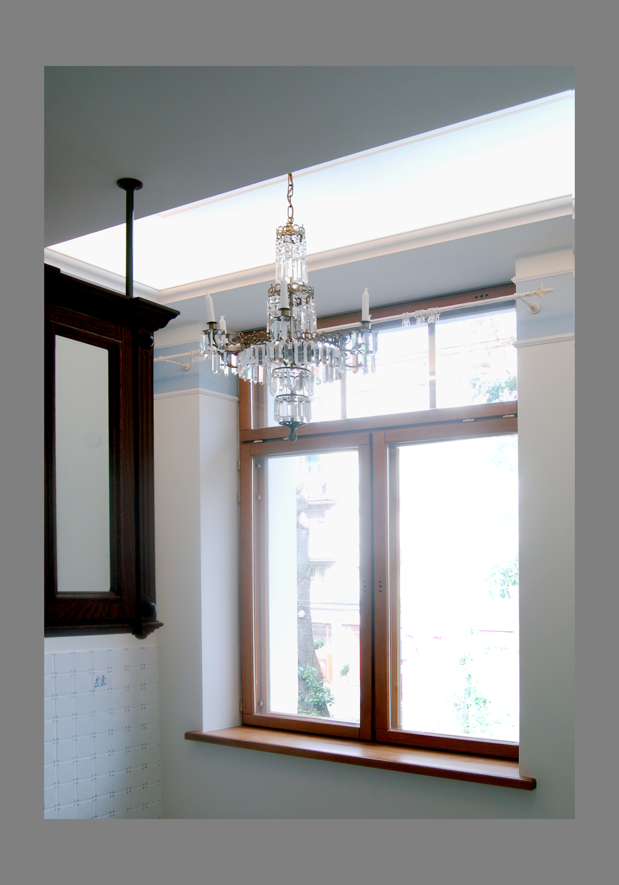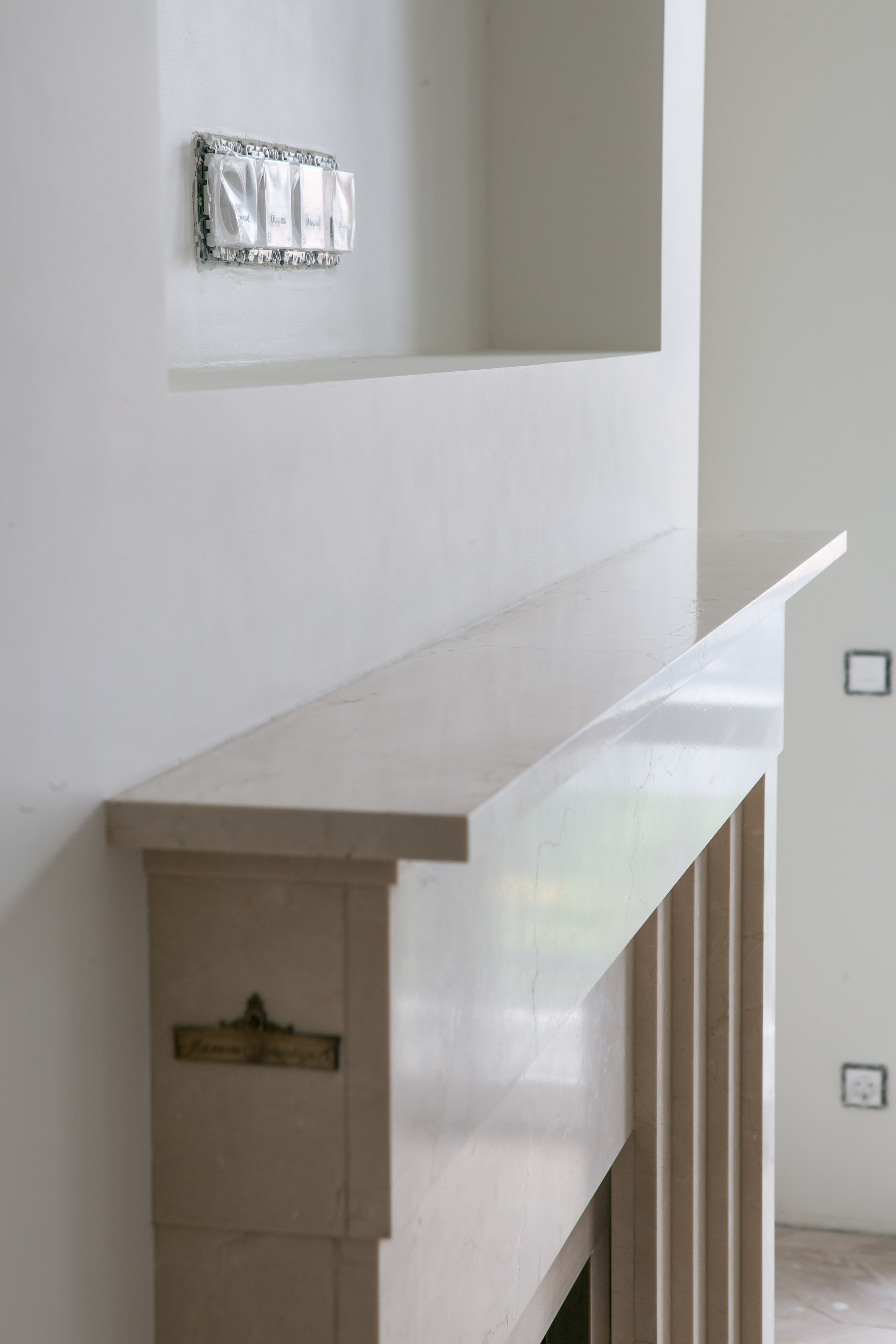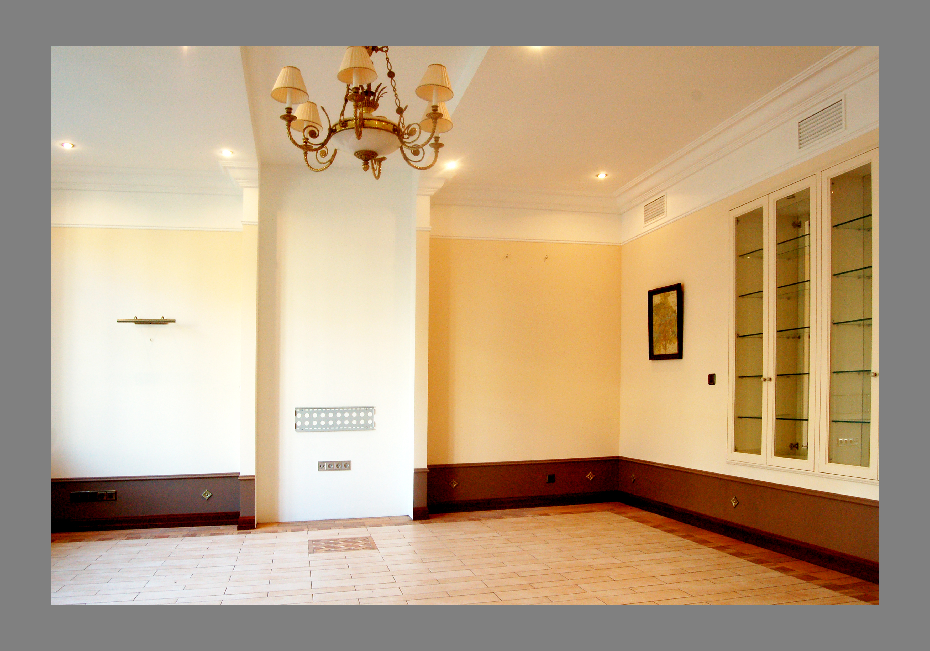 Крестовский остров,кв. 120 м. кв.,отделка "под ключ".Комната 1.Пол - плитка. Потолок и стены - окраска. Краска - Benjamin Moore. Оборудование для окраски - компрессор. Фактура - "мел".