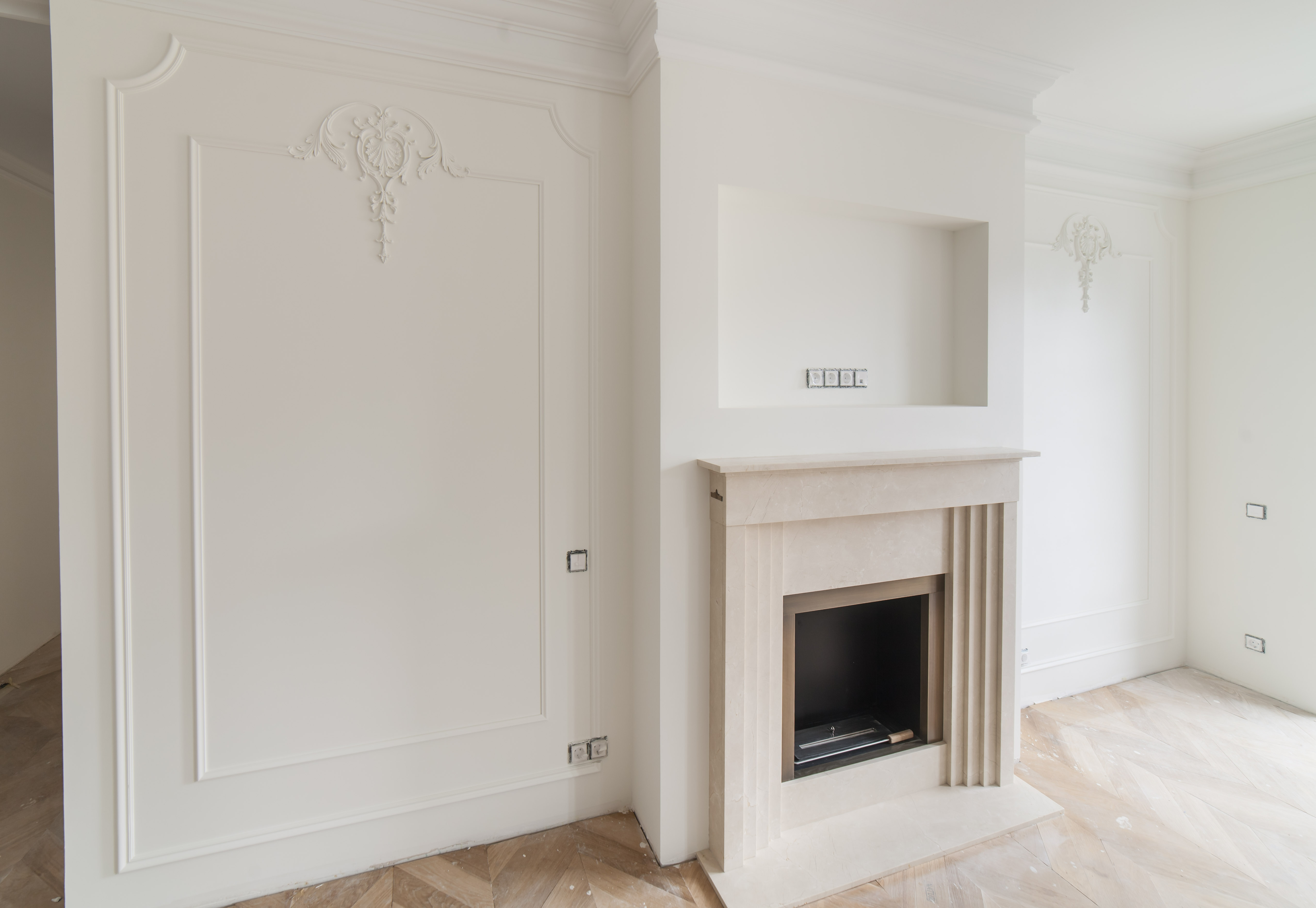 Крестовский остров, кв. 120 м. кв., отделка "под ключ". Комната 2. Пол - плитка. Потолок и стены - окраска. Краска - Benjamin Moore. Оборудование для окраски - компрессор. Фактура - "мел".