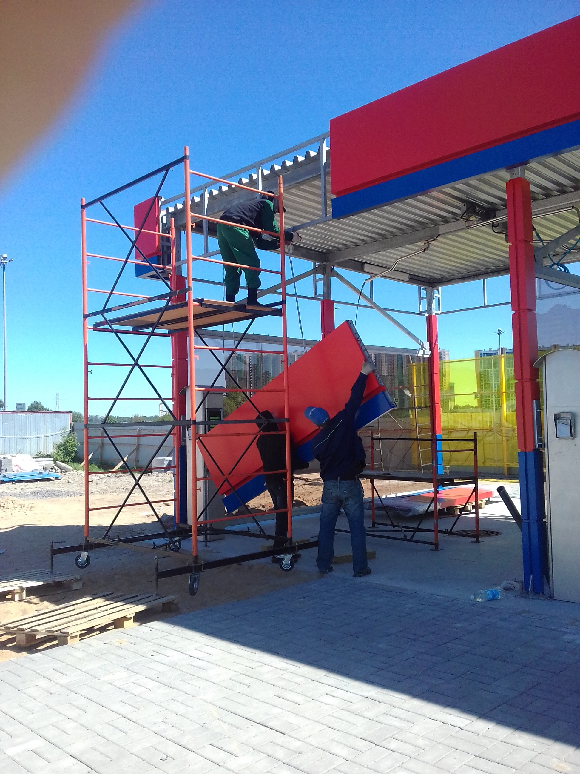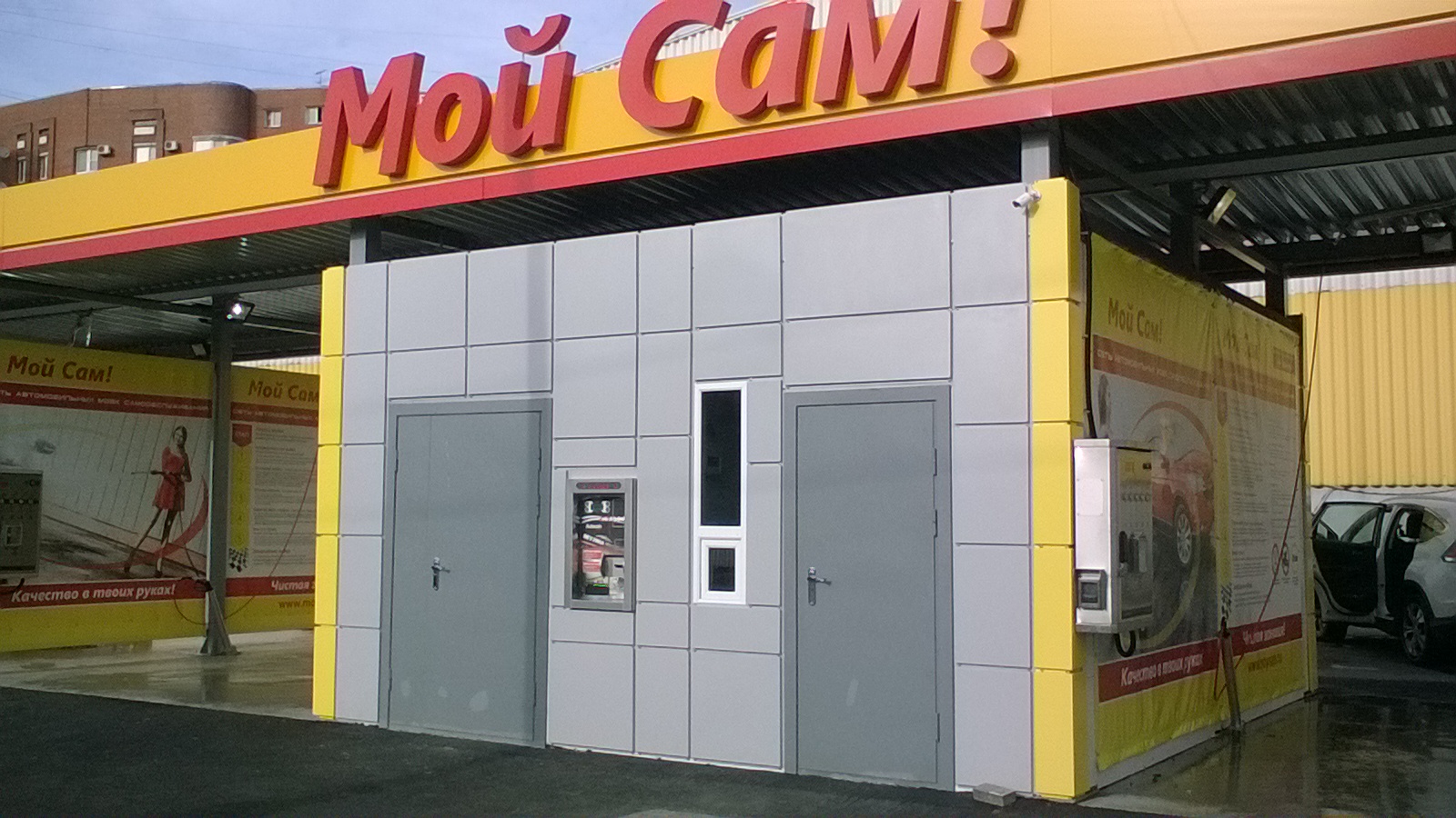 Фасад. Автомойка МойСам. Богатырский,Озерки, Типанова,Большевиков,Таллинское шоссе. Изготовление,поставка,монтаж облицовки. Металлокассеты.