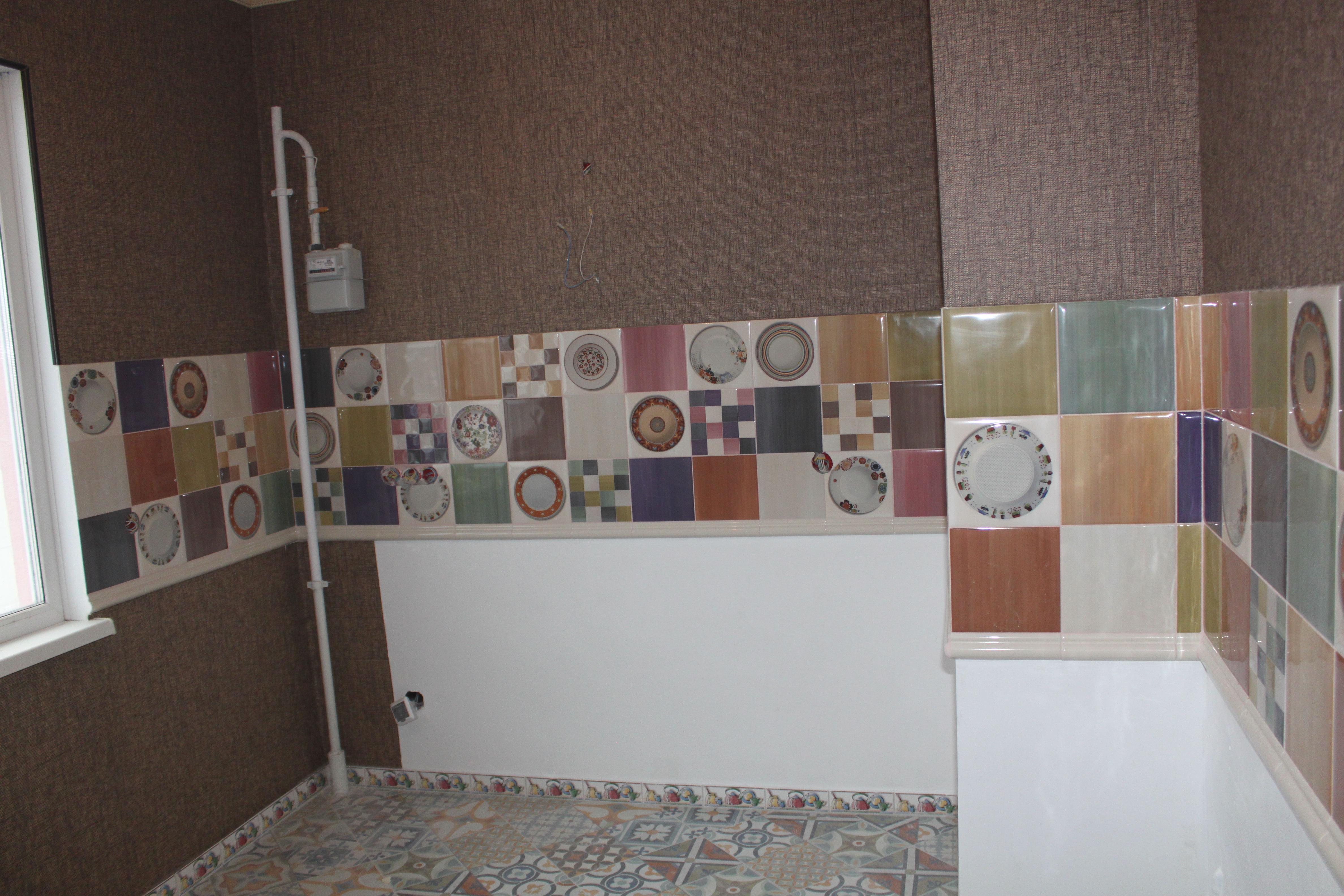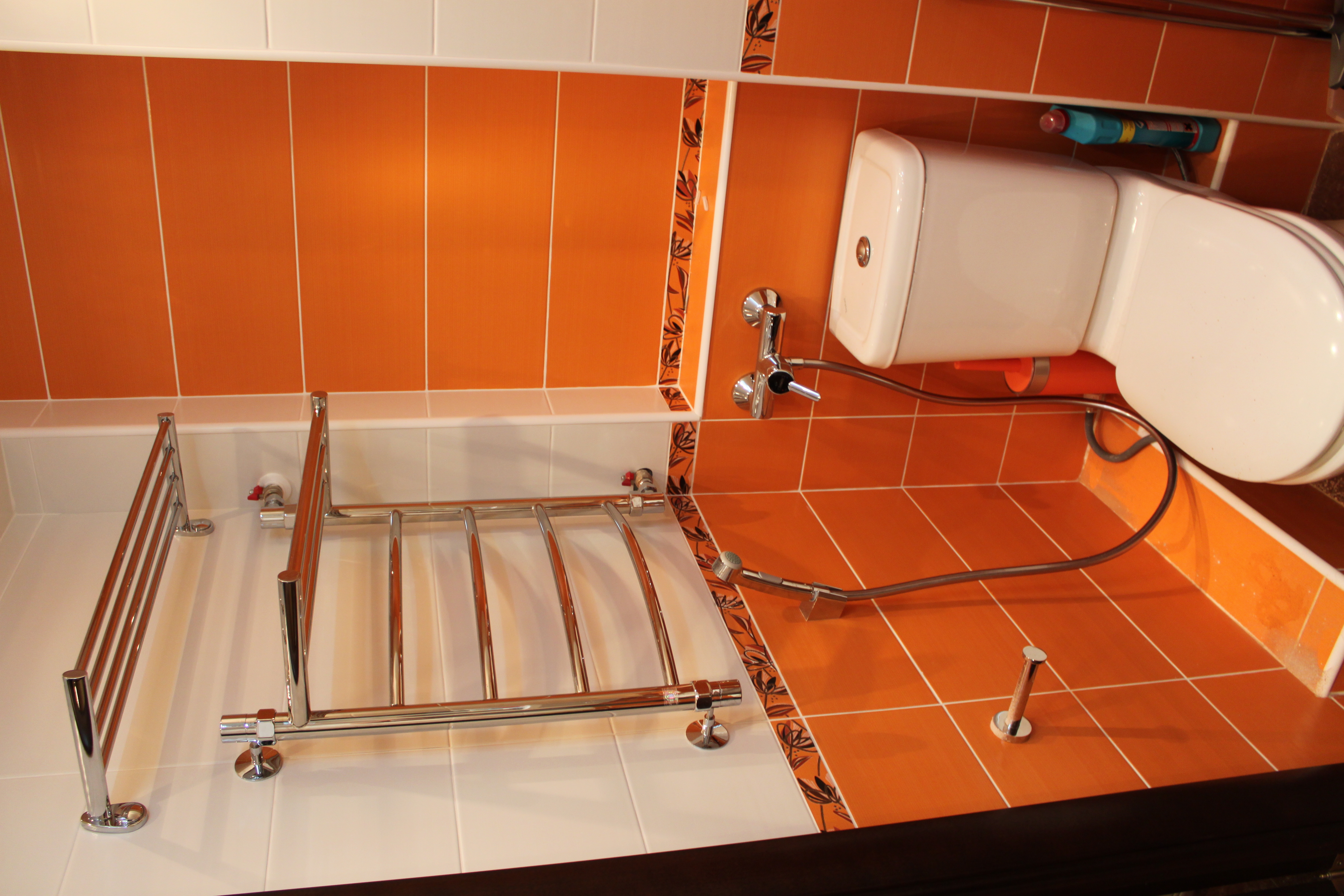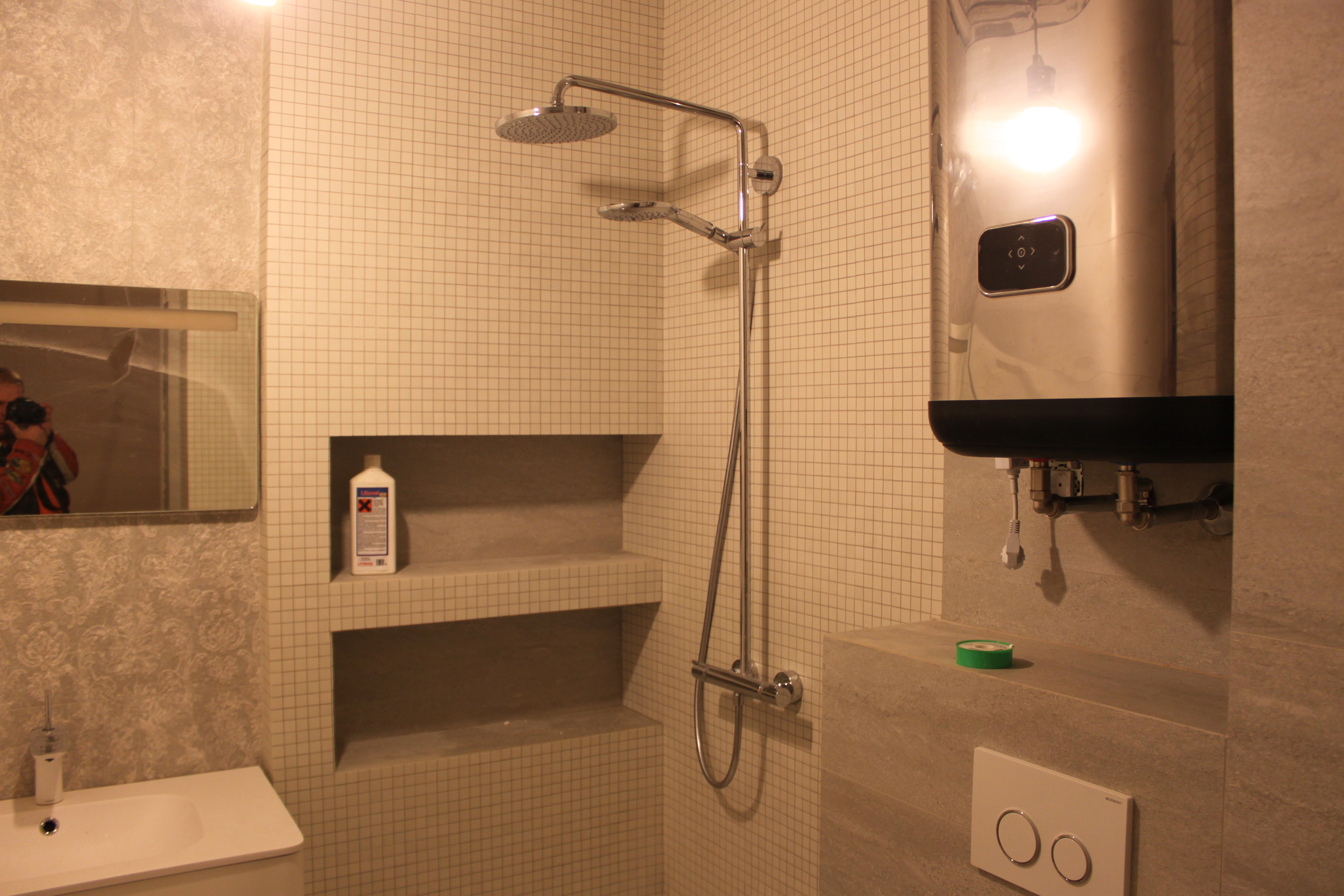Подрезка и укладка кафеля выполнена неплохо, но в местах выхода труб, там где плитка резалась пополам, половинки состыкованы не в уровень. Мелочь, но неприятно. Затирку можно было выполнить и по аккуратнее.