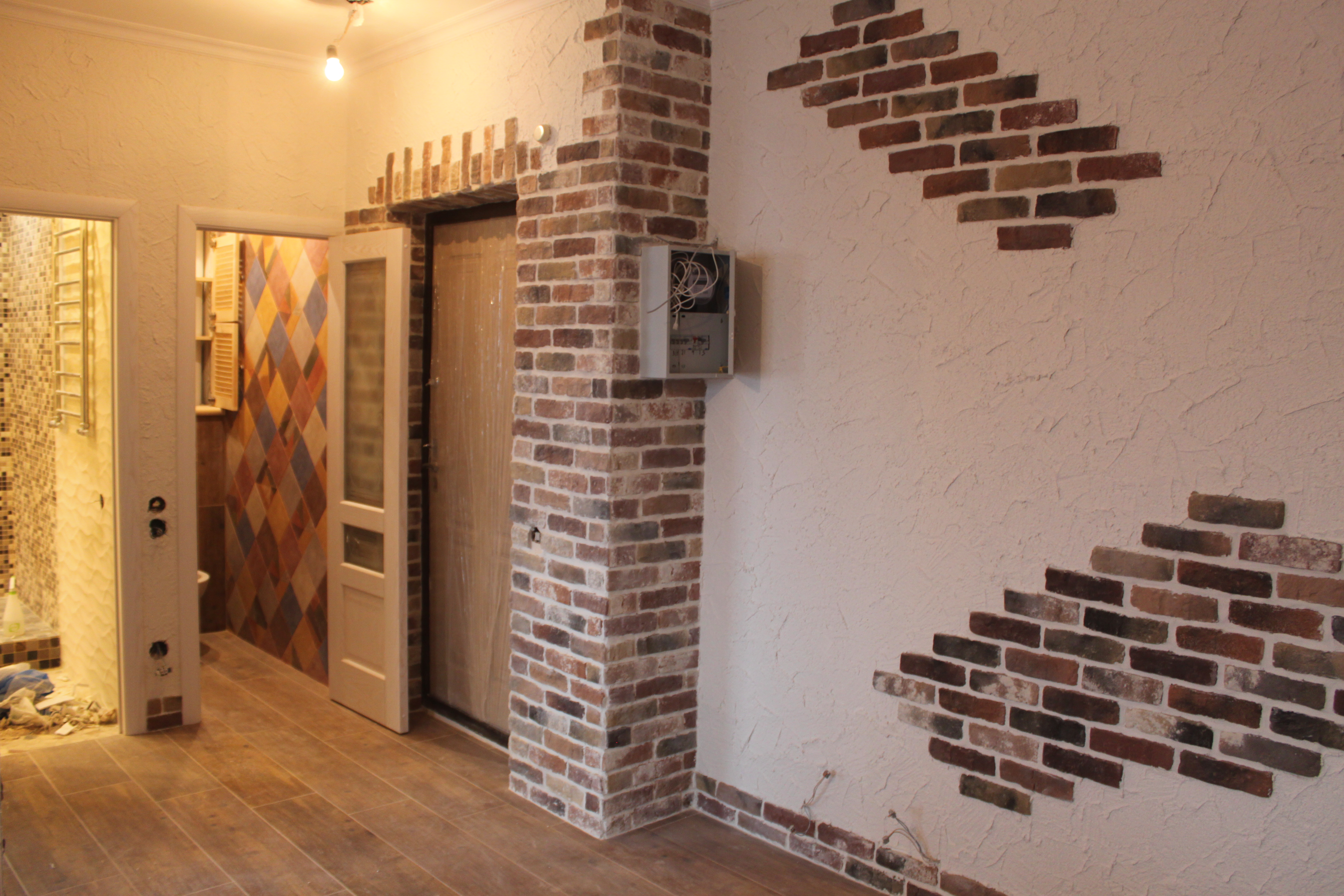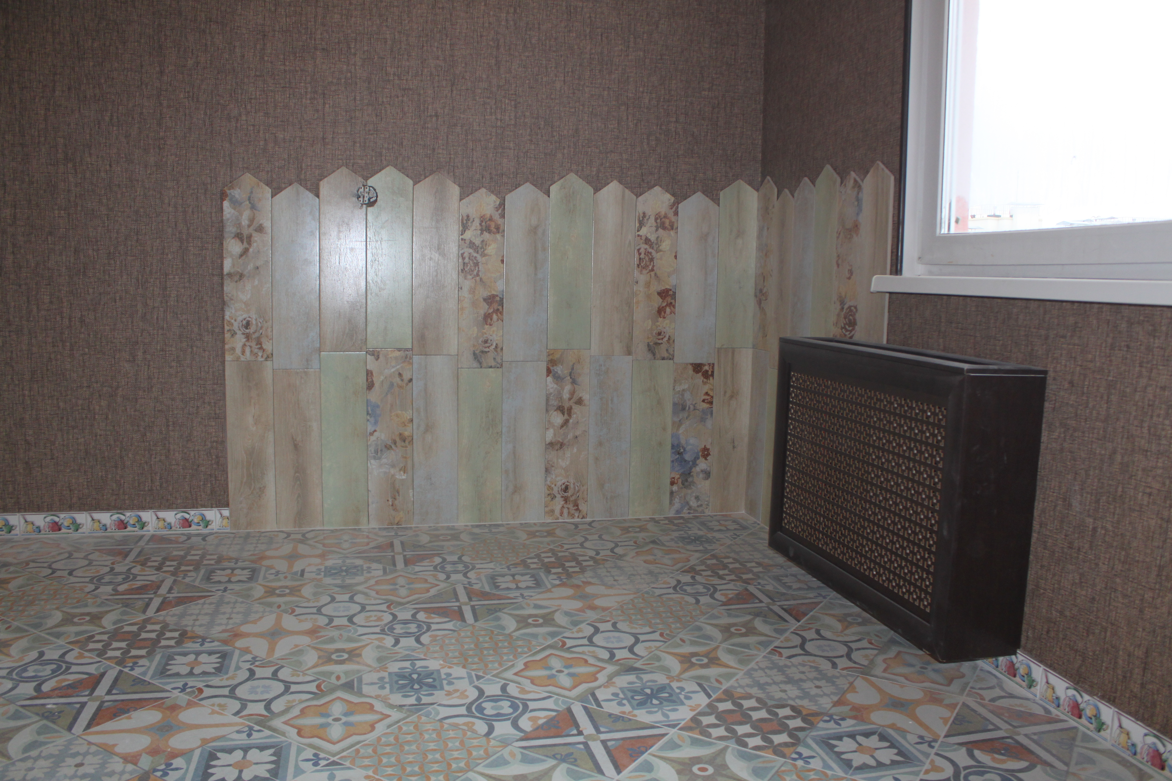 Бордюр выполнен без понимания того, что с бордюром будет стыковаться наличник двери. И наличник должен доходить до пола. Так сейчас не установлена коробка двери, то необходимо было финишную плитку подрезать таким образом, что бы было место наличнику закрывать щель между, коробкой и стеной. Иван финишную плитку сделал в уровень со стеной и как теперь установить наличник после установки коробки неясно.